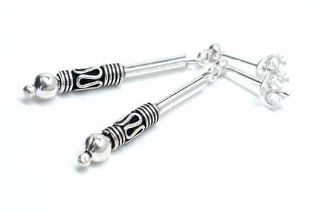 長いシャフトにボリュームのあるエスニックなデザインのパーツが、優雅に揺れ動くシルエットがエレガントなスタッドピアスです。