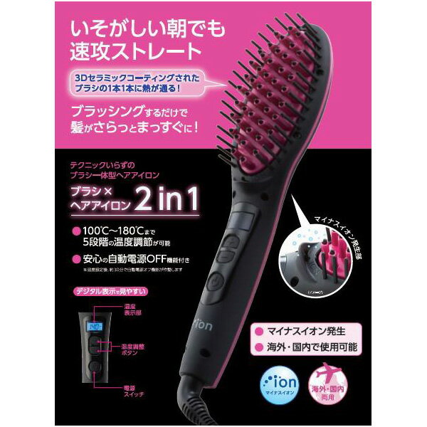 ■全世界で820万台の販売実績! ■ヘアアイロンとへアブラシを融合した進化型ハイブリッドヘアブラシ ■ブラシをとかすだけで、簡単にツヤサラストレートができる! ■5段階の温度調節機能(100℃・120℃・140℃・160℃・180℃) ■自動電源OFF機能付きで安心(30分) ■スイッチを入れてから約90秒で準備完了(140℃の場合) ■持ち運びに便利な耐熱性トラベルケース付! ■マイナスイオン発生、海外・日本国内で使用可能! ■本体:設定温度に到達するまでの時間の目安 100℃:約1分 140℃:約1分30秒 180℃:約2分 ※室温や家庭の電源事象により変わります。