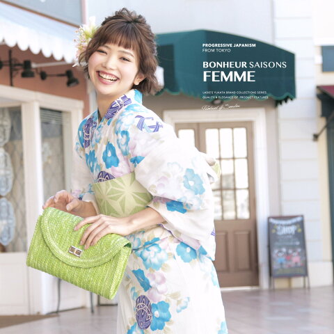 浴衣 セット レディース レトロ 浴衣セット 大人 3点セット 白系 ホワイト 水色 黄緑 椿 つばき 鞠 ラメ 綿麻 半幅帯 女性 ボヌールセゾン 【送料無料】【あす楽対応】【浴衣 セット】